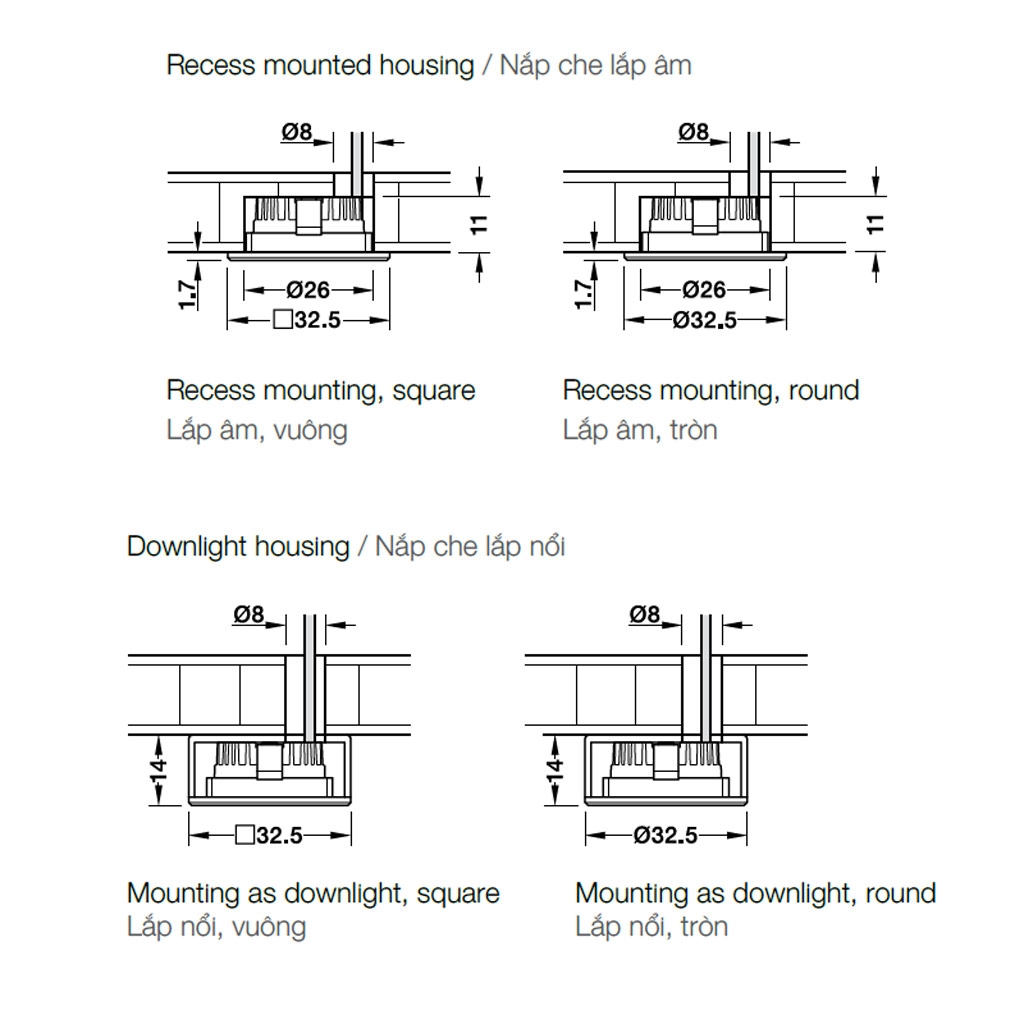 Lắp đặt: Lắp âm vào lỗ khoan sẵn có, kẹp giữ hoặc lắp nổi bằng vít