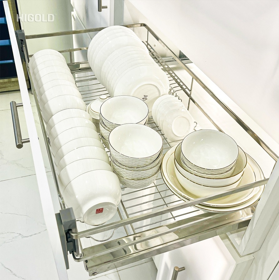 - Sản phẩm có thể tương thích với nhiều loại tủ bếp khác nhau, tải trọng 30kg đựng được nhiều bát đĩa, đáp ứng nhu cầu của gia đình đông người.