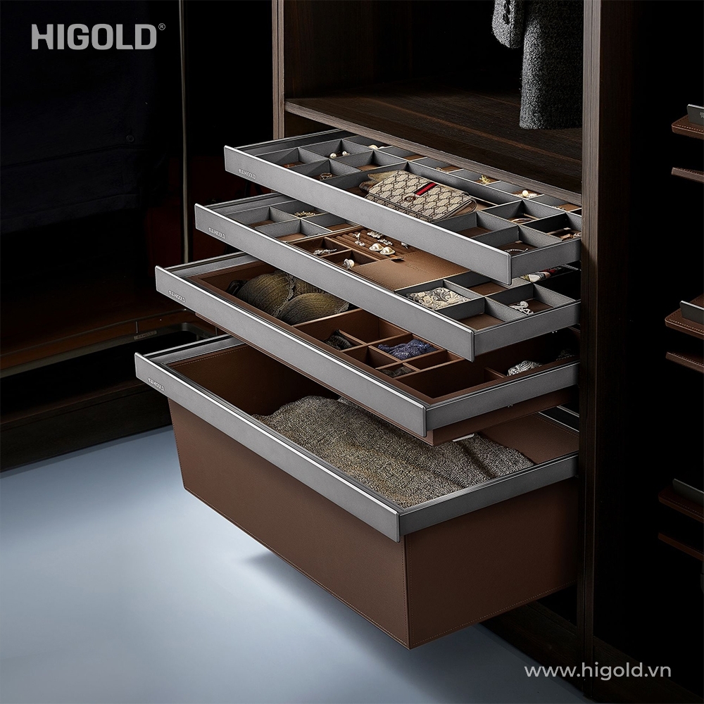 - Ngăn kéo cao đựng quần áo A Series được làm từ hợp kim nhôm bọc da cao cấp, chống trầy xước, mang lại vẻ sang trọng và tinh tế, dễ dàng kết hợp với nhiều phong cách nội thất khác nhau.